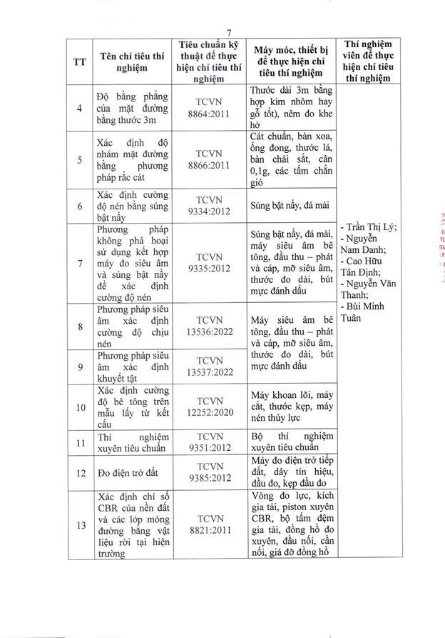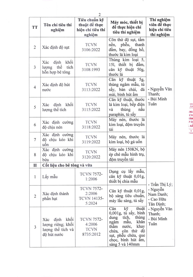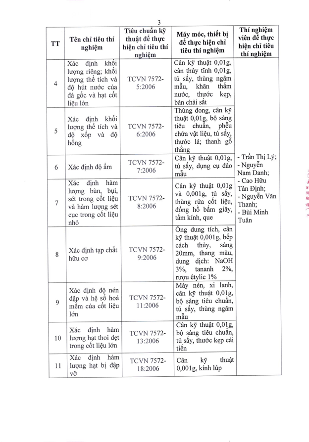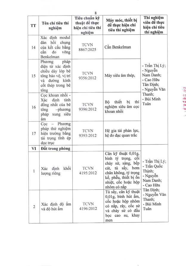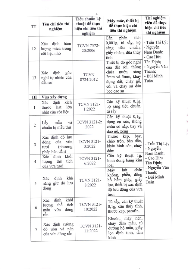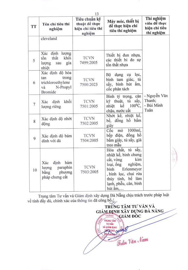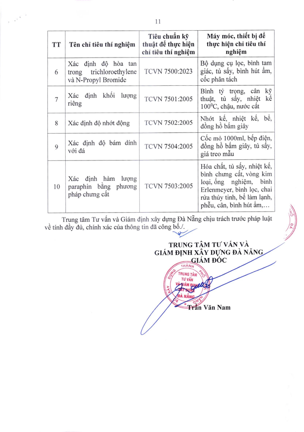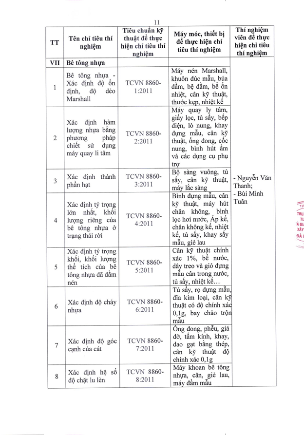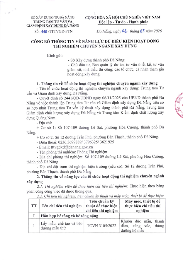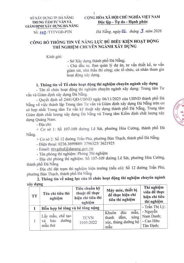Căn cứ Quyết định số 2441/QĐ-UBND ngày 06/11/2025 của Ủy ban nhân dân thành phố Đà Nẵng ban hành về việc thành lập Trung tâm Tư vấn và Giám định xây dựng Đà Nẵng, chúng tôi trân trọng công bố thông tin về tổ chức hoạt động thí nghiệm chuyên ngành xây dựng như sau: